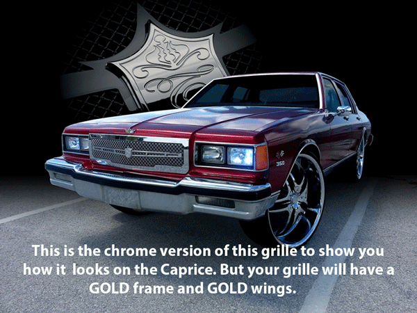 This is a one piece custom chrome mesh grille that fits the 1986-1990 Chevy Caprice. It comes with 24K Gold plating on the entire frame andalso on the wings on either side of the Tiarra badge in the center. The Tiarra badge is chrome. This grille is constructed from solid automotive grade stainless steel that is triple chromed and polished to a perfect mirror finish. It has a beautiful dual weave mesh and is a full replacement grille.